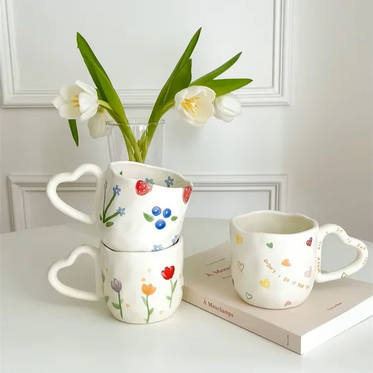 Bring a touch of spring to your daily routine with this charming ceramic mug, featuring hand-painted floral, heart, or strawberry motifs. Its slightly irregular, handcrafted shape adds a unique, cozy feel, while the 350ml size makes it perfect for coffee, tea, or a warm breakfast drink.